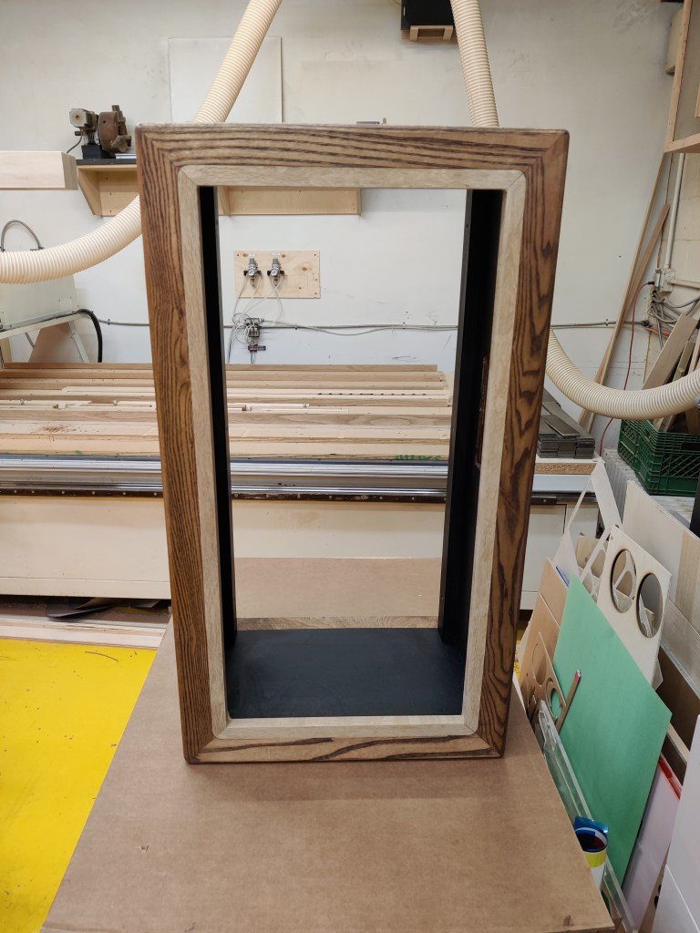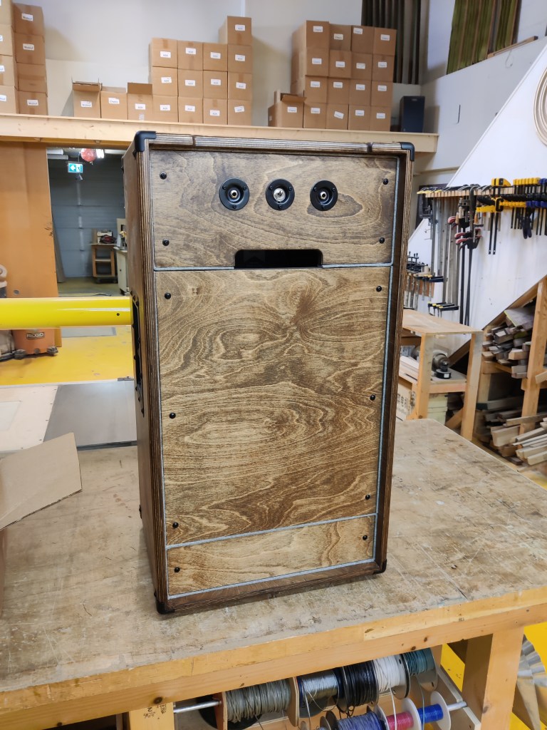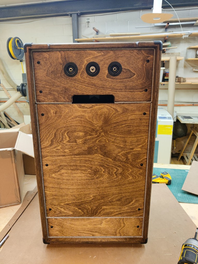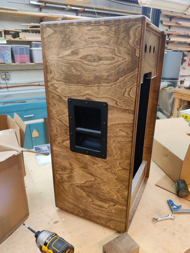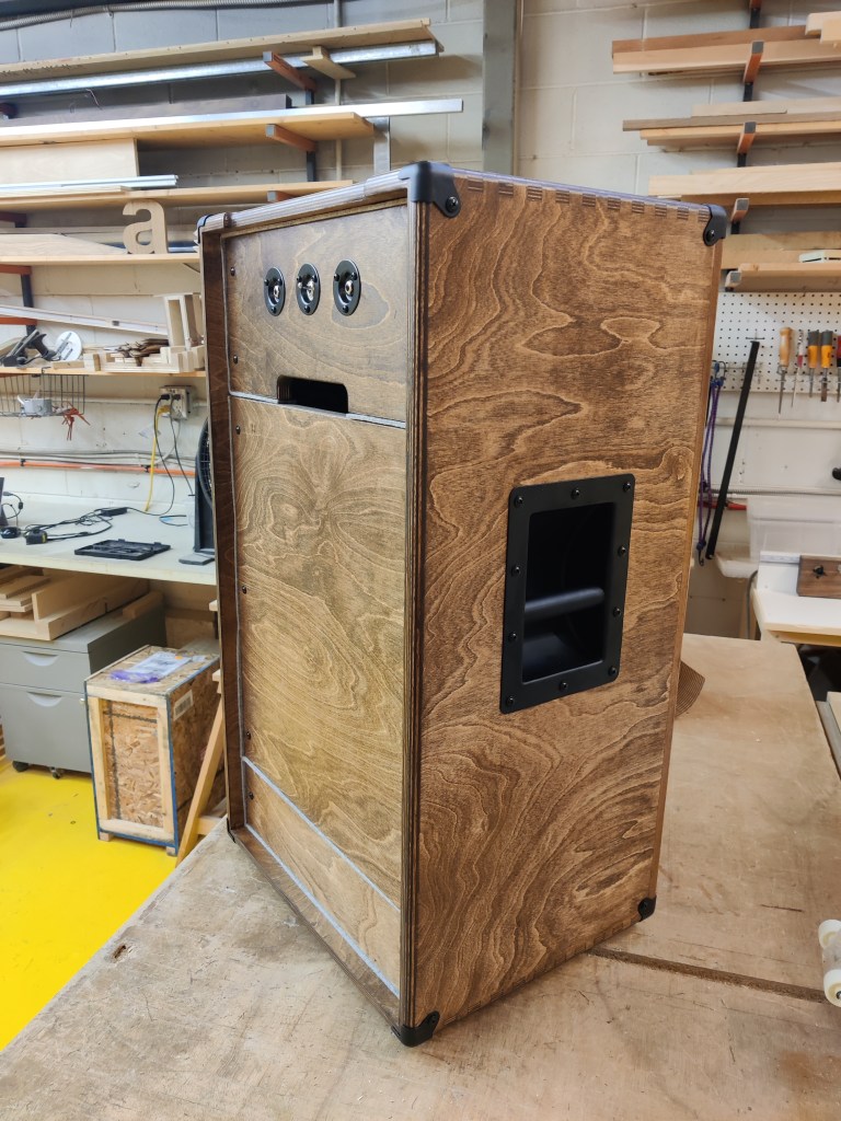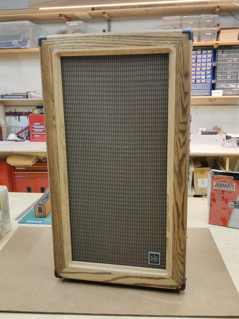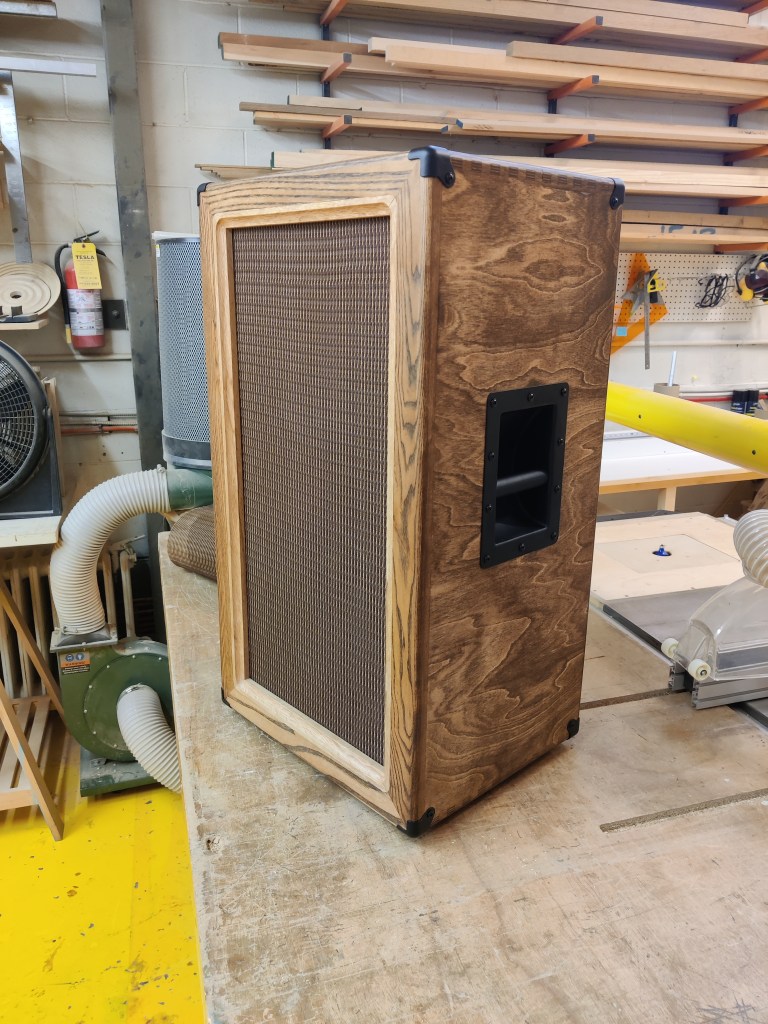 I wired both speakers up to a switch in the back that allows for 4, 8 and 16 ohm impedence options. 4 and 16 ohm impedences are accessible in a mono configuration, while 8 ohm impedece is accessible only in stereo. I spent so much time on the fence cycling through every tolex option available that I decided to go without it and embrace the wooden-box look. I also designed a removable back panel so it can either be fully closed or open-back. After some staining, matching grillcloth and black hardware, it gives a bit of a ‘modern-gothic-grandpa-furniture’. I think it looks pretty sweet, and it works great, so can’t complain.