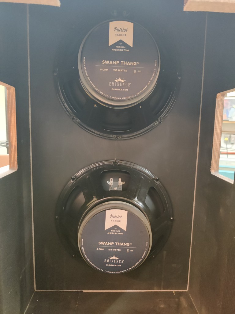 Space can sometimes be a determining factor for amplifiers. At least for me it is. As space is such a tight comoddity and I was tired of playing through a headphone amp, I needed something with a small footprint. So I designed this vertical 2×12 amp cabinet loaded with two Eminence Swamp Thang speakers. These were chosen primarily because they handle distortion quite well, carry a massive power rating (150W stereo to 300W mono) so I can hook them up to just about anything, and because they have a funny name.