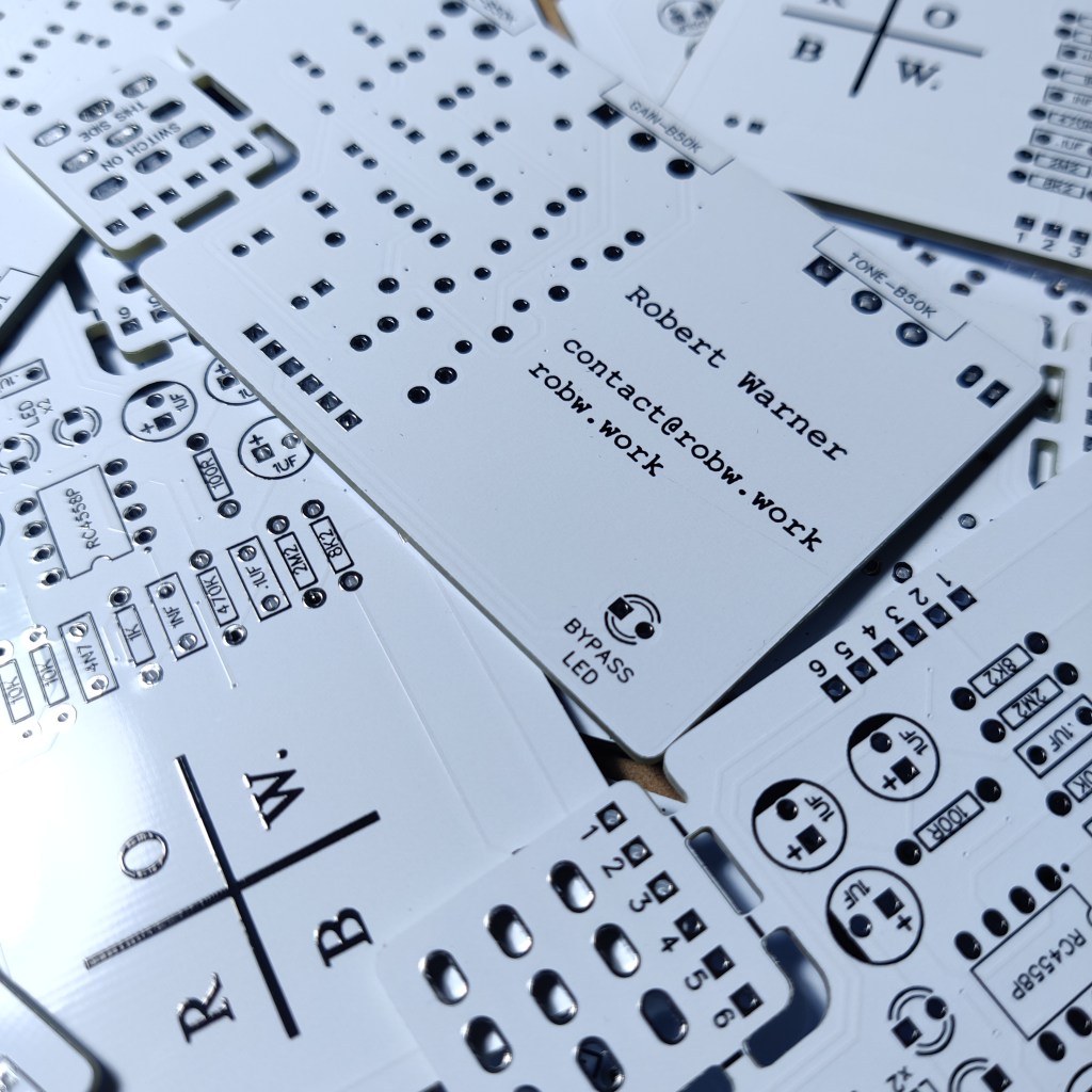 I’m not breaking any new ground with this idea, but I thought it appropriate to build a business card around a distortion circuit. The card contains the values for all the components listed within their footprints on the card. Anyone with a card can -and should– populate the board with thier respective components. With the addition of a little bit of off-board wiring, you should have a functional little circuit.