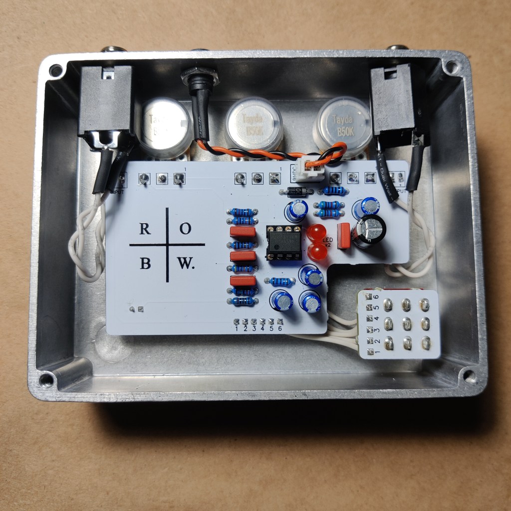 It’s nothing too wild, just a simple OpAmp distortion circuit with a bit of a wacky layout. It offers a decent amount of drive while retaining quite a bit of transparency and dynamic response depending on how hard you want to play.