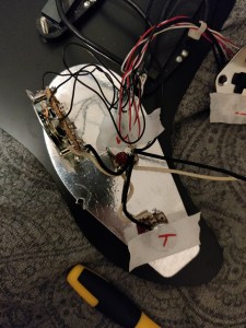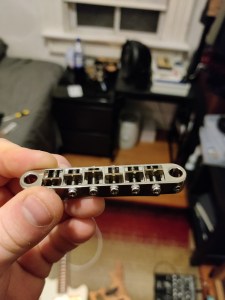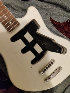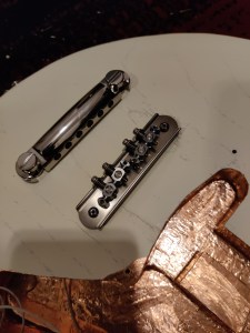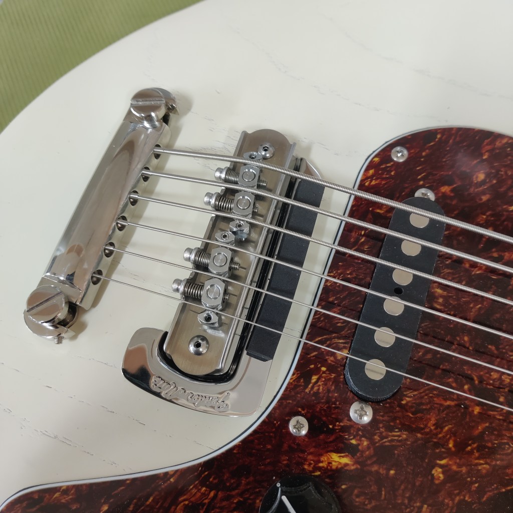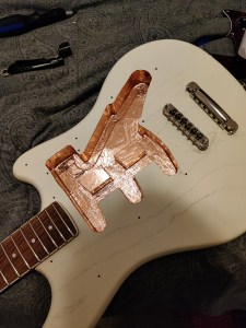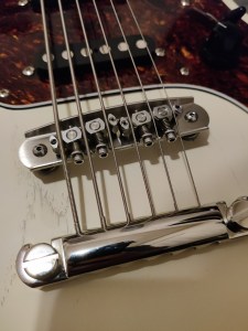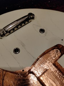 When it arrived, I noticed it had some some of that textbook hum that comes from poor grounding and insulation, so I insulated the crap out of it with some copper tape. This started a slippery slope for exploring the various upgrade possibilities this instrument could hold. Over time I found the bridge to be a little uncomfortable, so I upgraded it to a Mastery M1 Bridge. These were intended replacements for Jazzmasters and Jaguars, however it wasn’t exactly a plug-and-play solution for the Hellcat. I had to make various fastener adjustments and fabricate some fittings to get the bridge to sit just right. But once it did, it felt great to play.