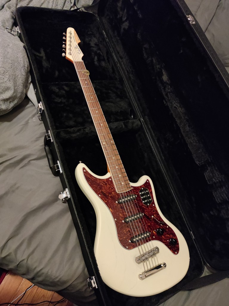 For the uninitiated, this is a Schecter Hellcat-VI. It looks like a pretty conventional offset guitar somewhat akin to a Fender Jazzmaster. However, this is Schecter’s take on Fender’s ‘Bass-VI’. This format of instrument is not actually a guitar, but rather a 6 string bass in a guitar-like size. The scale length is 30″ (literally right in between bass and guitar) and takes custom-wound strings. I bought this because I don’t have a standard bass guitar and I find the size of a bass to be a little limiting for some of the stuff I like to play.