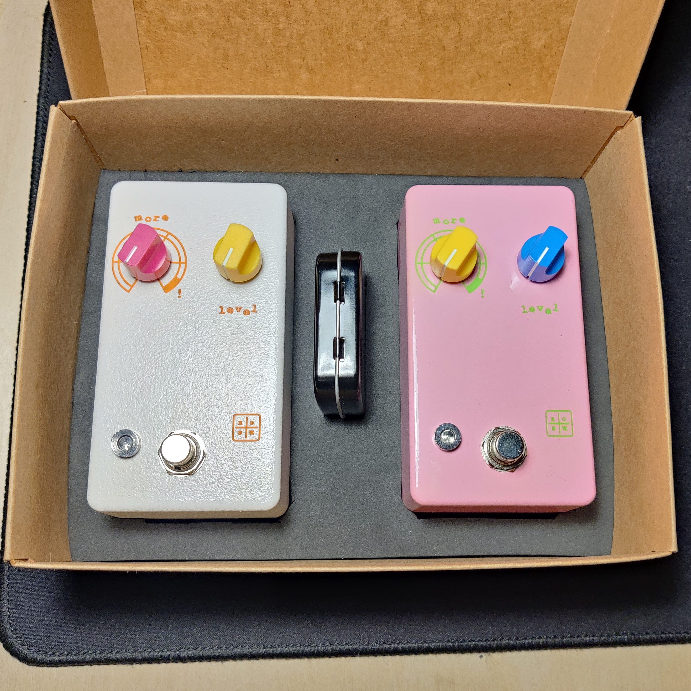 The tone filtering for the guitar circuit heavily scoops the mids, while maintaining a ton of treble and bass frequencies. This provides it with a balance of cutting high-end and some serious beef. The bass has a bit more of a darker sound, allowing the bottom end to get really heavy in the mix. Both have a pretty extreme clipping stage that absolutely obliterates the poor transistor trapped in the circuit. So much so in fact that the ‘more’ controls have a specified danger zone where the circuit starts to functionally fall apart a little bit if turned up too high.
