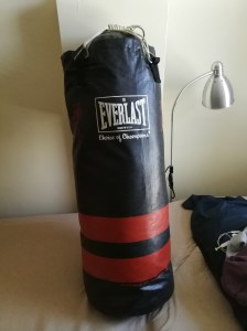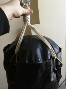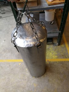 I spent a good couple of weeks chipping away at it, beating it from the inside out with a plastic round mallet to make it appear ‘stuffed’. I had the thought that I could try to put a bigger punch-like dent somewhere in the body, but I thought it would be funnier to have an inviting, un-punched steel punching bag.