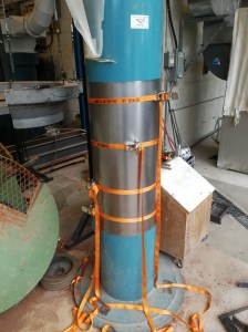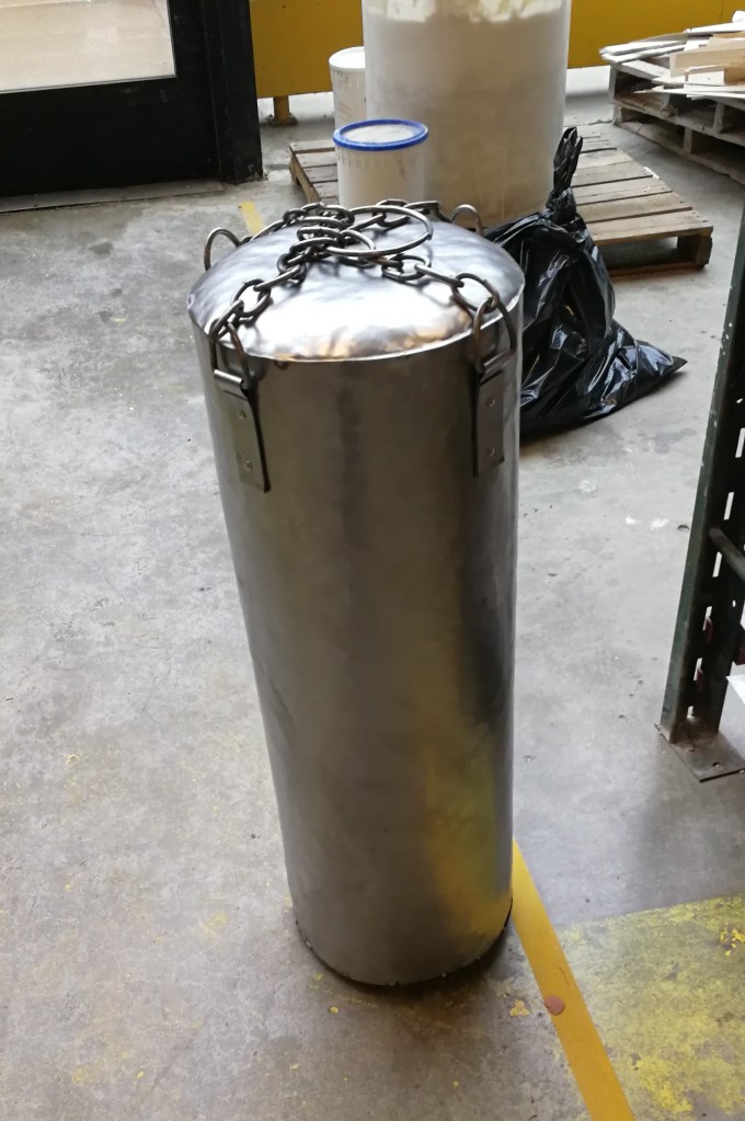 I was able to find a beat-up, used punching bag. I deconstructed it, so that I could take the exterior material panelling and transfer it to my sheet steel. With these shapes, I was then able to rebuild the cylindrical form at a 1:1 scale without much trouble. While forming the cylindrical body, I quickly realized that I needed some texture in order to make the form more identifiable as a punching bag rather than just a metal cylinder.